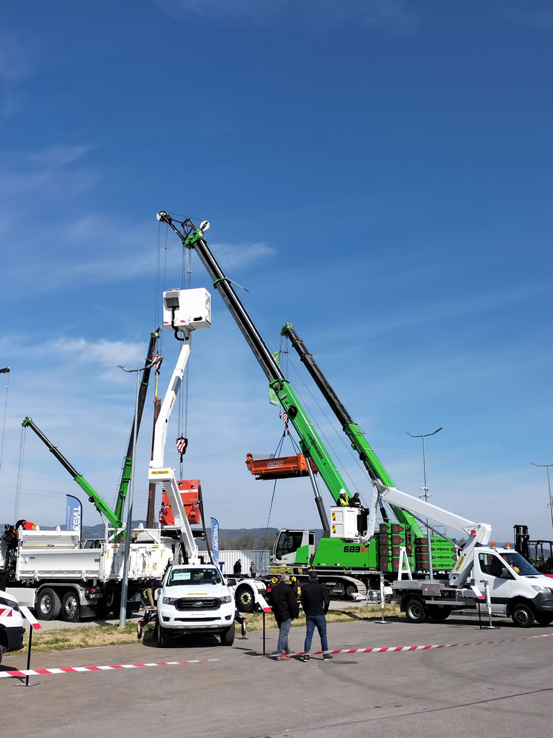 Sous le soleil de la Drôme, une partie de la gamme de grues Sennebogen, notamment les grues télescopiques sur chenilles, une des spécialités du constructeur, étaient de sortie.