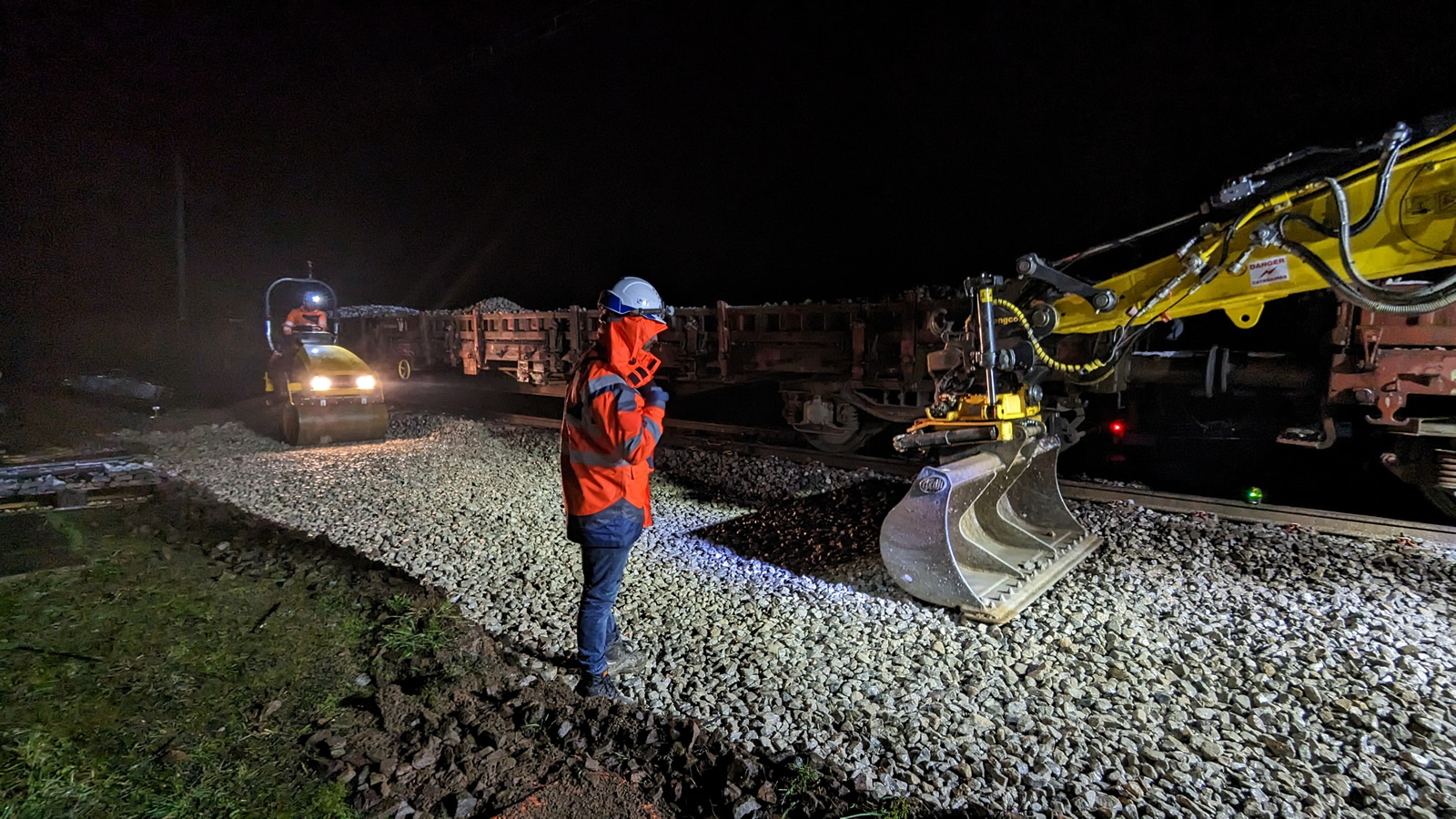 Après la mise à nue de la plateforme et la sous-couche de ballast est mise de niveau, sur les indications des relevés topo puis compactée.