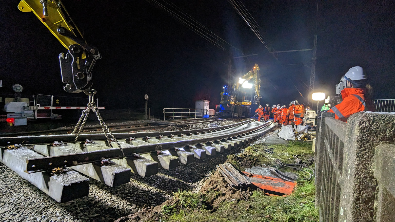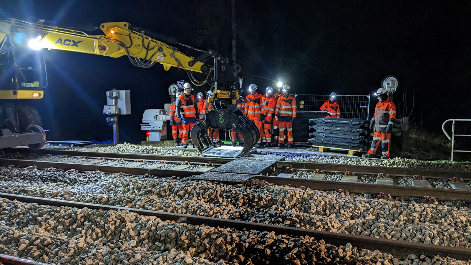 L’acheminement et le positionnement des panneaux de 12 m sont assurés par les deux pelles rail-route ACX24RR. Préparés sur la base arrière, ils sont constitués de traverses béton et de rails mannequins.
