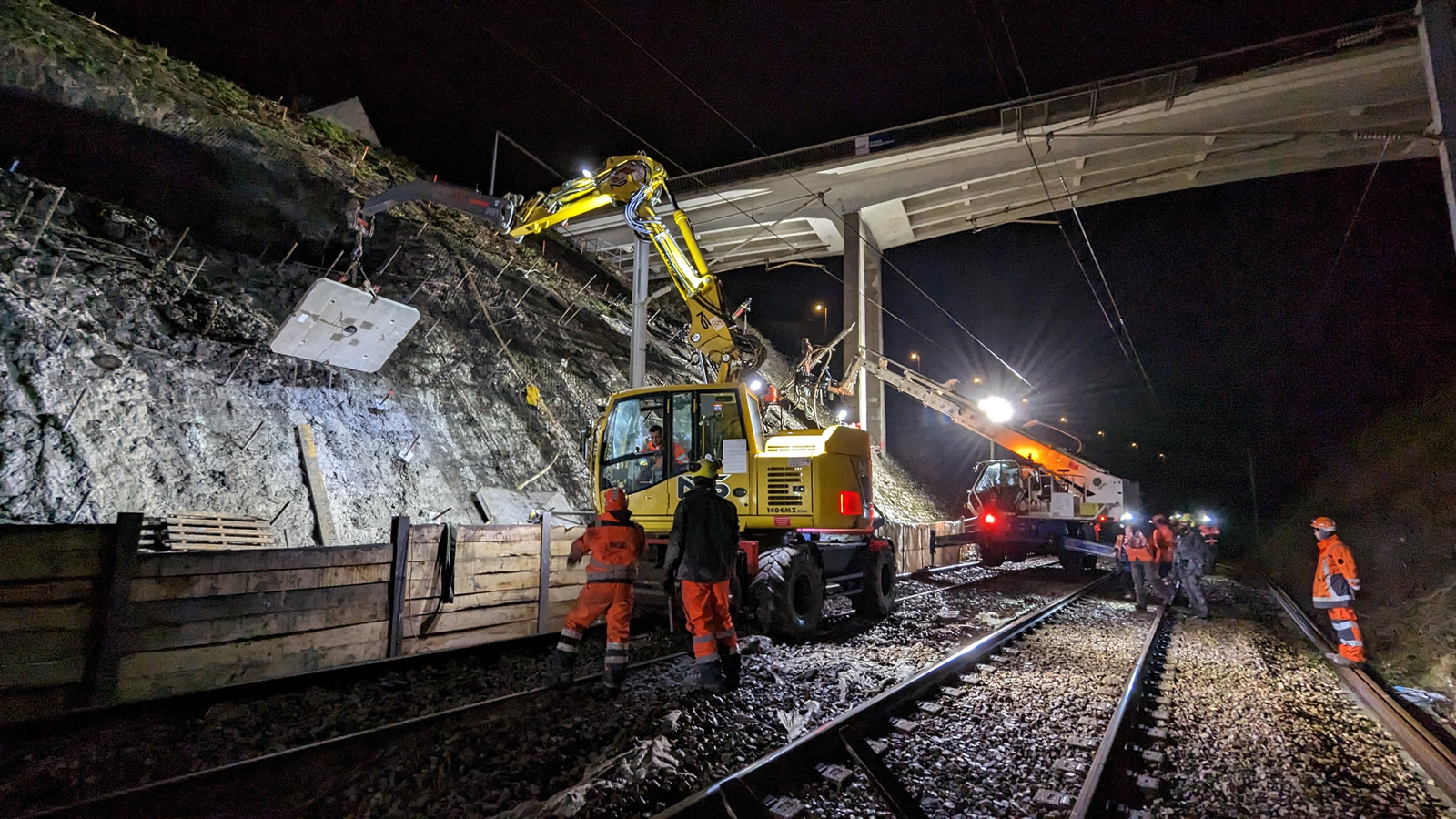 En partie affaissé suite à de très fortes pluies, le talus ferroviaire de Wimereux a fait l’objet depuis décembre 2022 de travaux de confortement. Spécifiques, ces derniers ont nécessité l’intervention des équipes spécialisées de NGE Fondations et de SNCF Réseau. Pour évacuer près de 200 m3 de terre, poser 200 barres d’ancrage, injecter 11 000 litres de ciment et poser 135 écailles en béton, les équipes ont eu recours à une pelle rail-route, un Merlo et à une grue Kirow pour poser les dernières écailles.