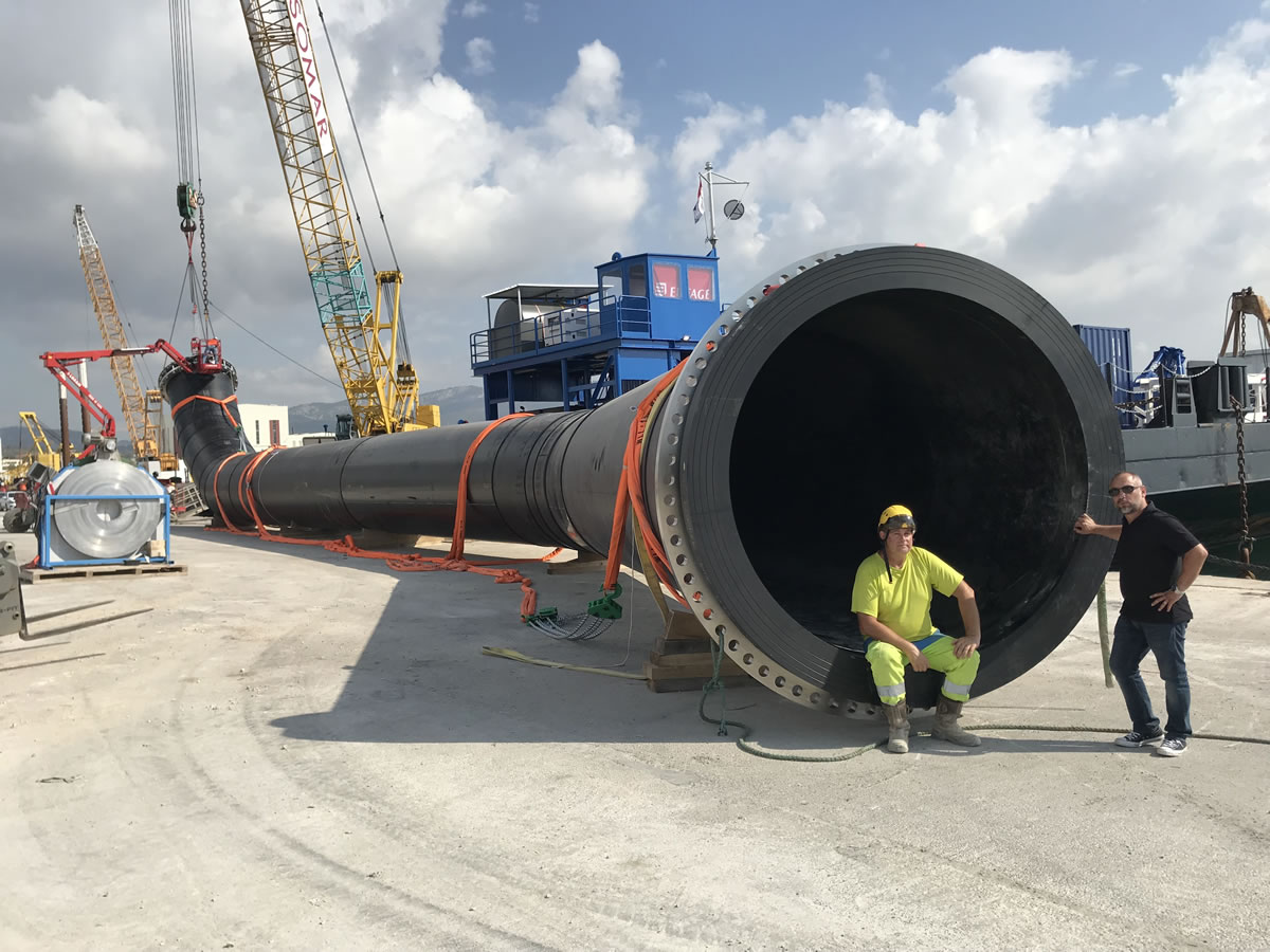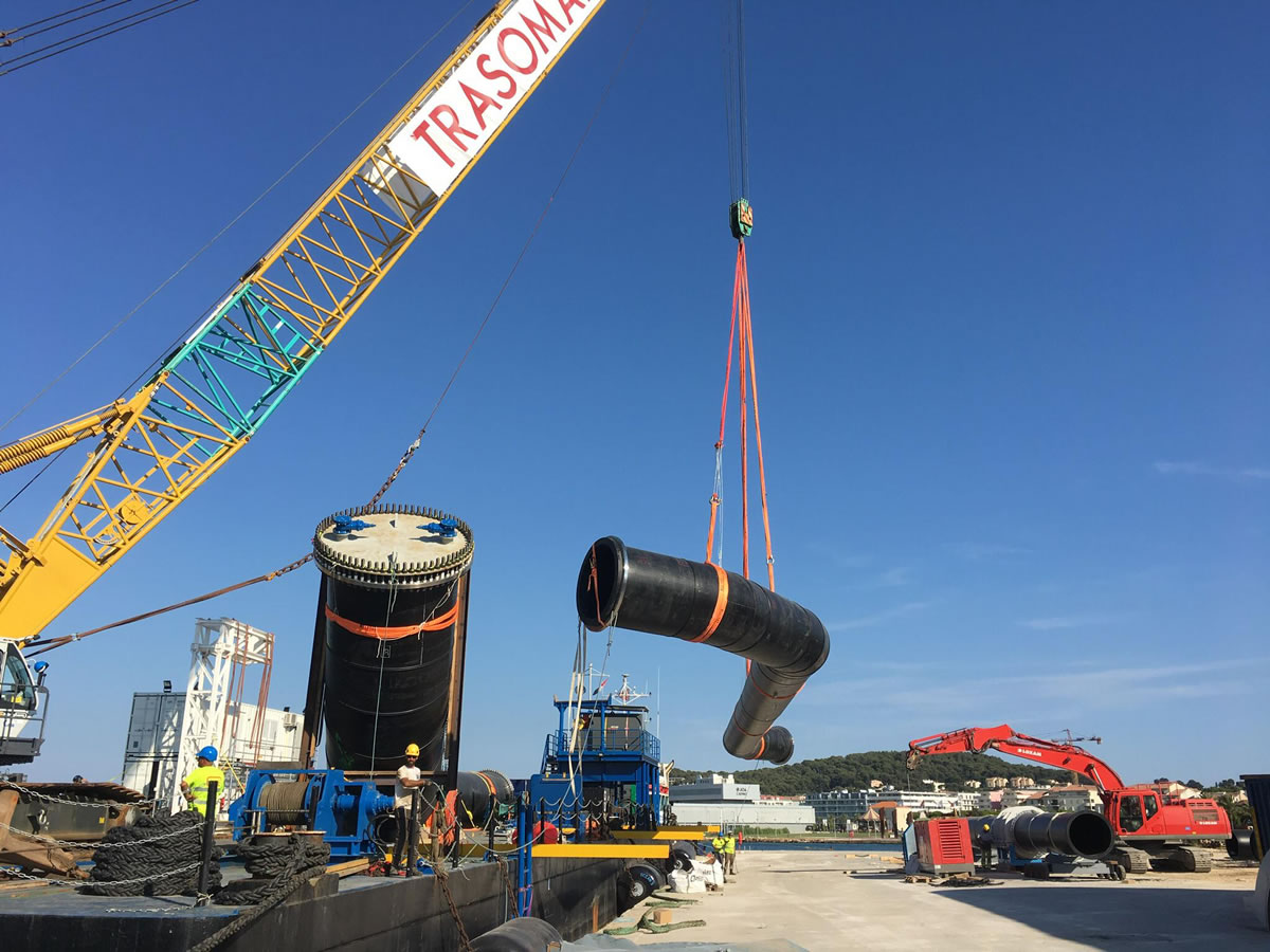 Pour transporter les tronçons de l’émissaire jusqu’à Monaco, la société Tra.so.mar, en charge des travaux sous-marins, s’est servie d’une barge. Les plus longs tronçons ne tenant pas sur la barge ont été remorqués par flottaison.